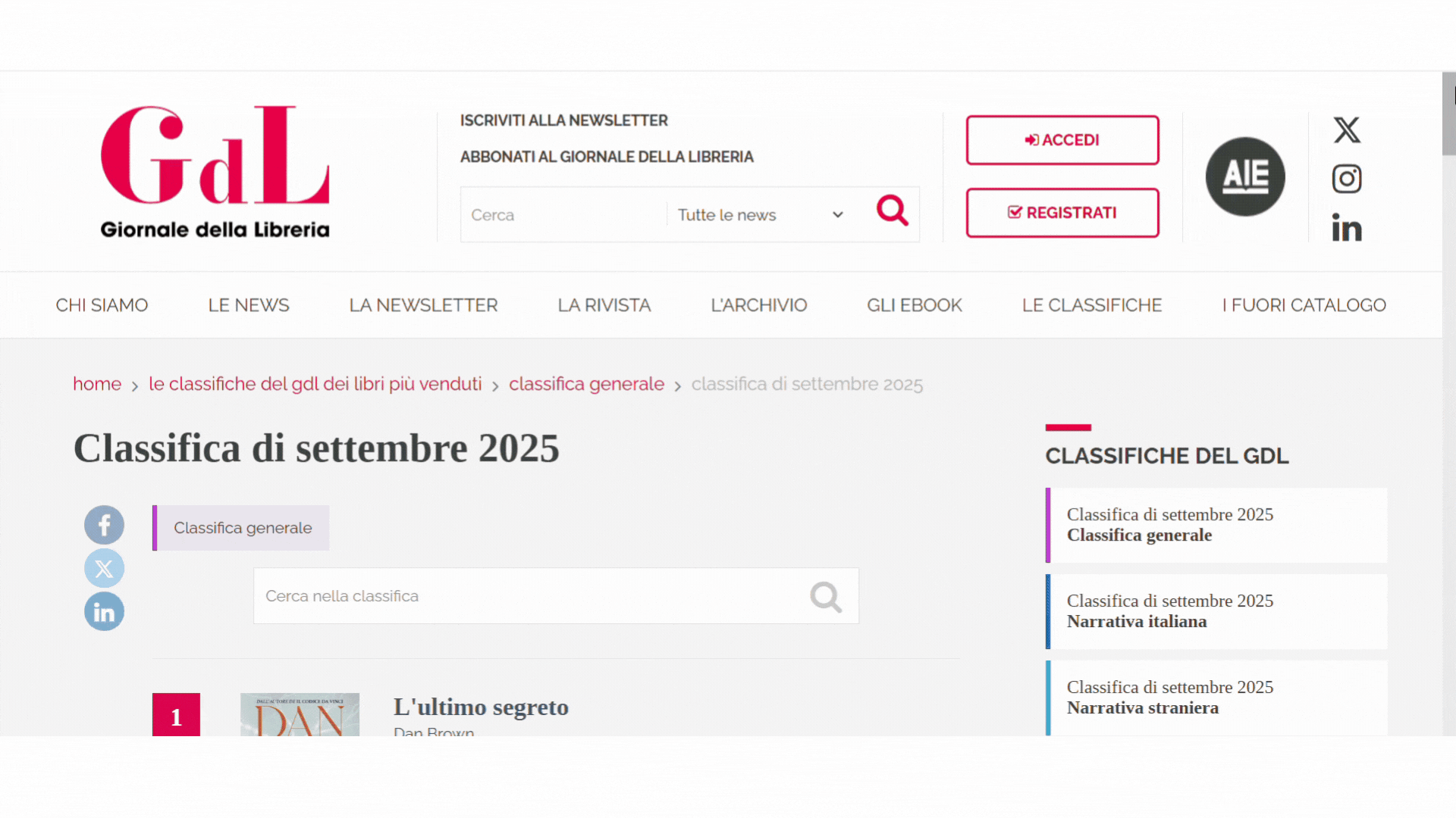 Sono online da oggi le classifiche del Giornale della Libreria dei libri più venduti nei canali trade, relative al mese di settembre 2025.