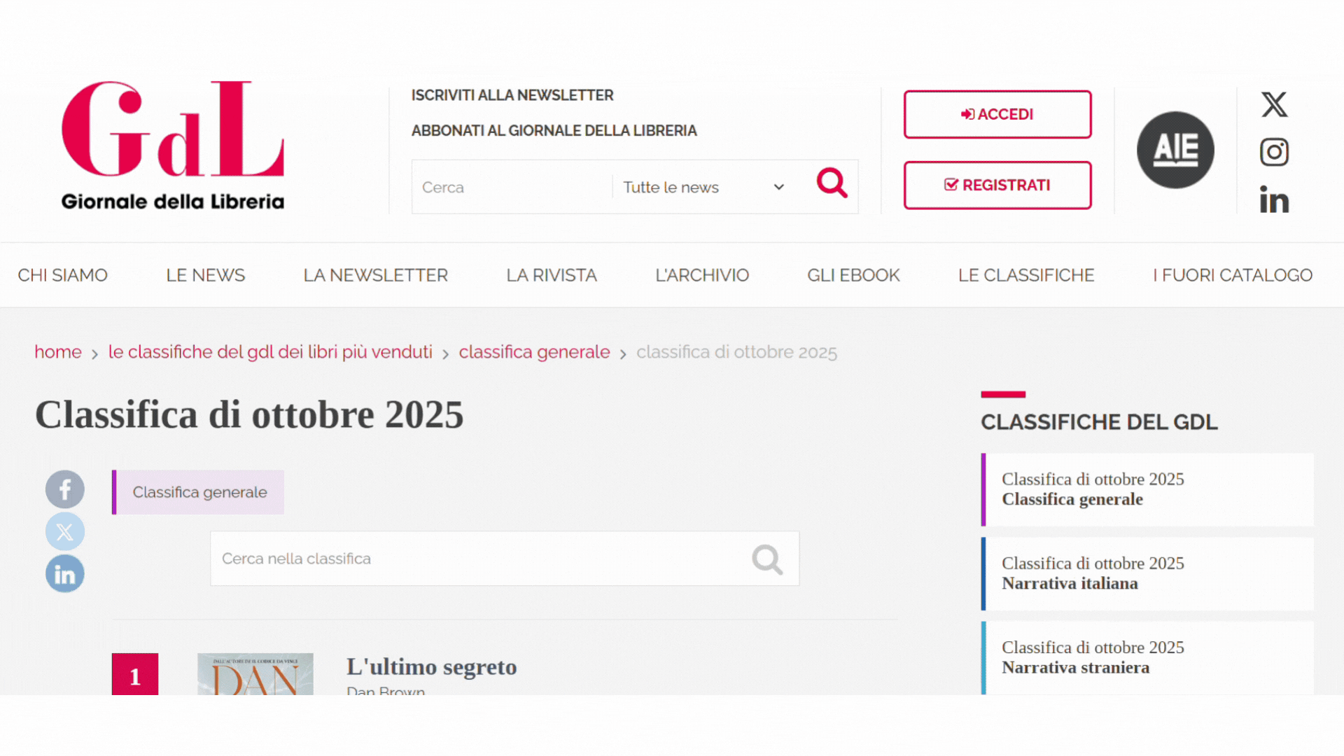 Sono online da oggi le classifiche del Giornale della Libreria dei libri più venduti nei canali trade, relative al mese di ottobre 2025.