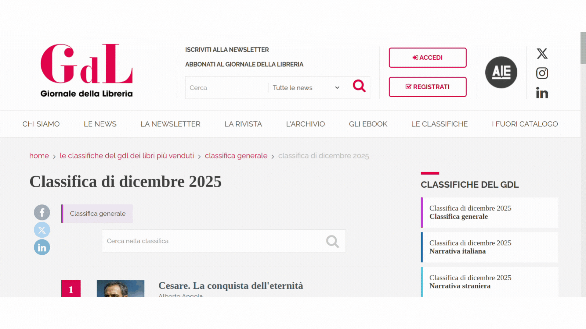 Sono online da oggi le classifiche del Giornale della Libreria dei libri più venduti nei canali trade, relative al mese di dicembre 2025.