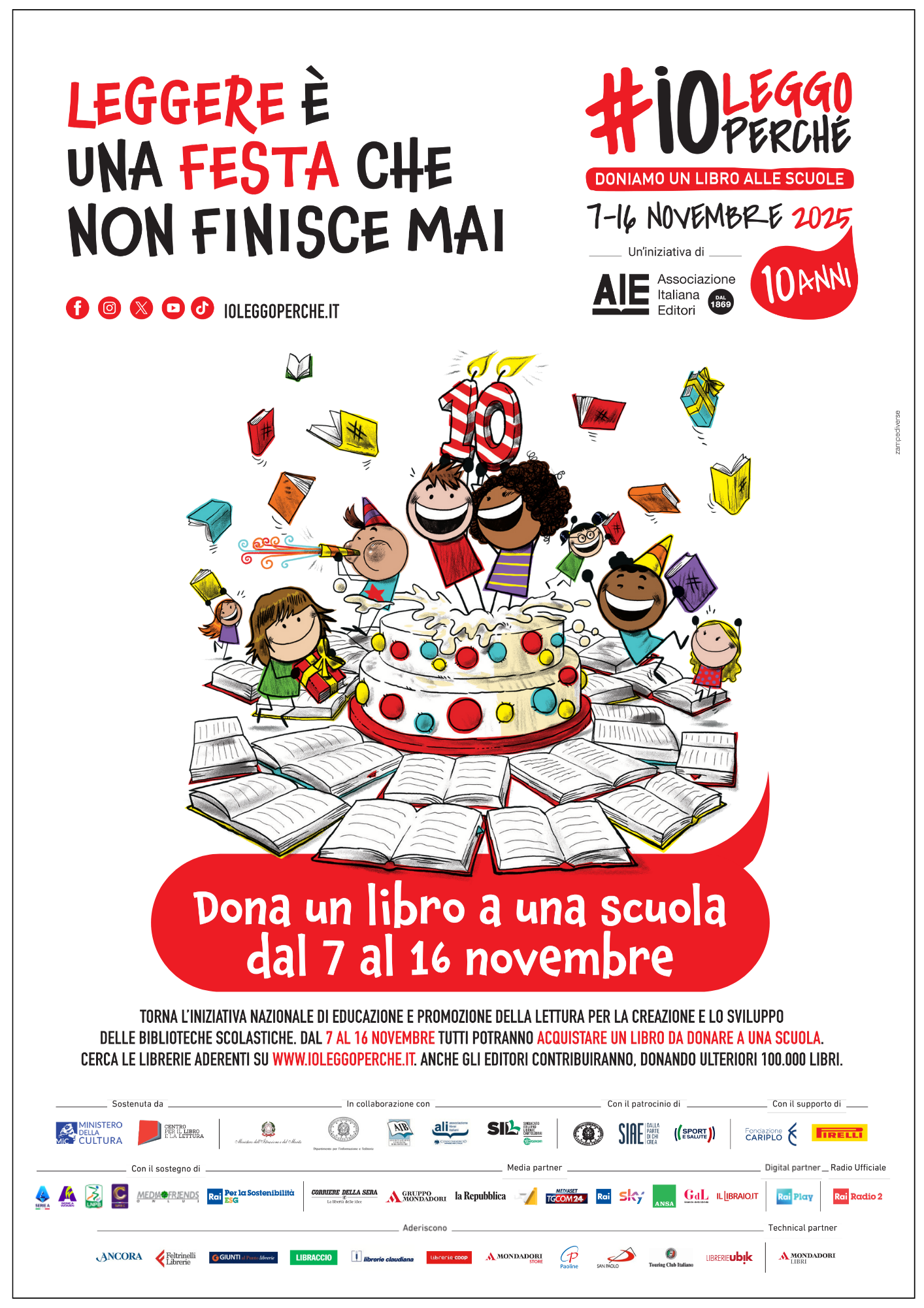 Si aprirà con una festa il 7 novembre, a partire dalle 18, con un grande evento diffuso, organizzato con la collaborazione di Associazione Italiana Librai (ALI) e Sindacato Italiano Librai e Cartolibrai (SIL) in tutte le librerie italiane aderenti. Un momento di condivisione e divertimento per celebrare i primi dieci anni di #ioleggoperché, tra letture ad alta voce, pigiama party tra gli scaffali e incontri con gli autori. In dieci città – Milano, Roma, Torino, Vicenza, Firenze, Rimini, Napoli, Lecce, Messina e Cagliari – si terranno delle feste di compleanno in libreria con gli studenti e le studentesse delle scuole gemellate, per una serata speciale dedicata ai libri, ai giovani lettori e lettrici e a chi ha contribuito al successo del progetto. La festa è anche il tema della campagna di quest’anno, «Leggere è una festa che non finisce mai».