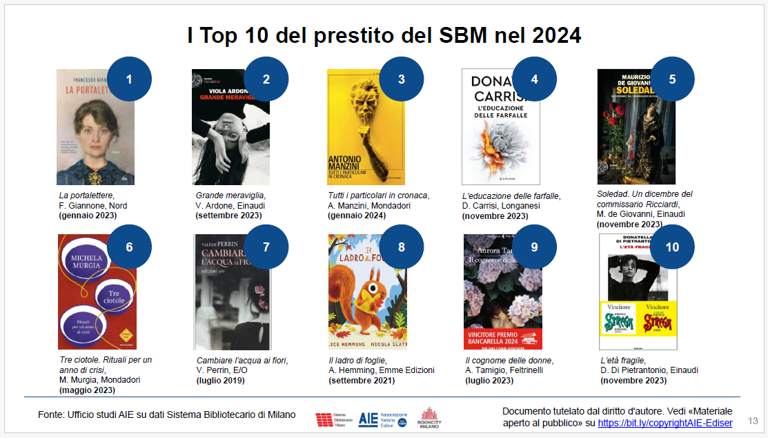 Importante e in crescita il ruolo delle biblioteche comunali: gli 89.800 utenti, cresciuti del 4% nel 2024, hanno preso in prestito quasi 13 libri ciascuno nel corso dei dodici mesi. I tre libri più prestati sono La portalettere di Francesca Giannone (Nord), Grande meraviglia di Viola Ardone (Einaudi), Tutti i particolari in cronaca di Antonio Manzini (Einaudi). Nella classifica delle autrici e degli autori più prestati troviamo al primo posto Maurizio De Giovanni, seguito da Jeff Kinney e da Gianrico Carofiglio.