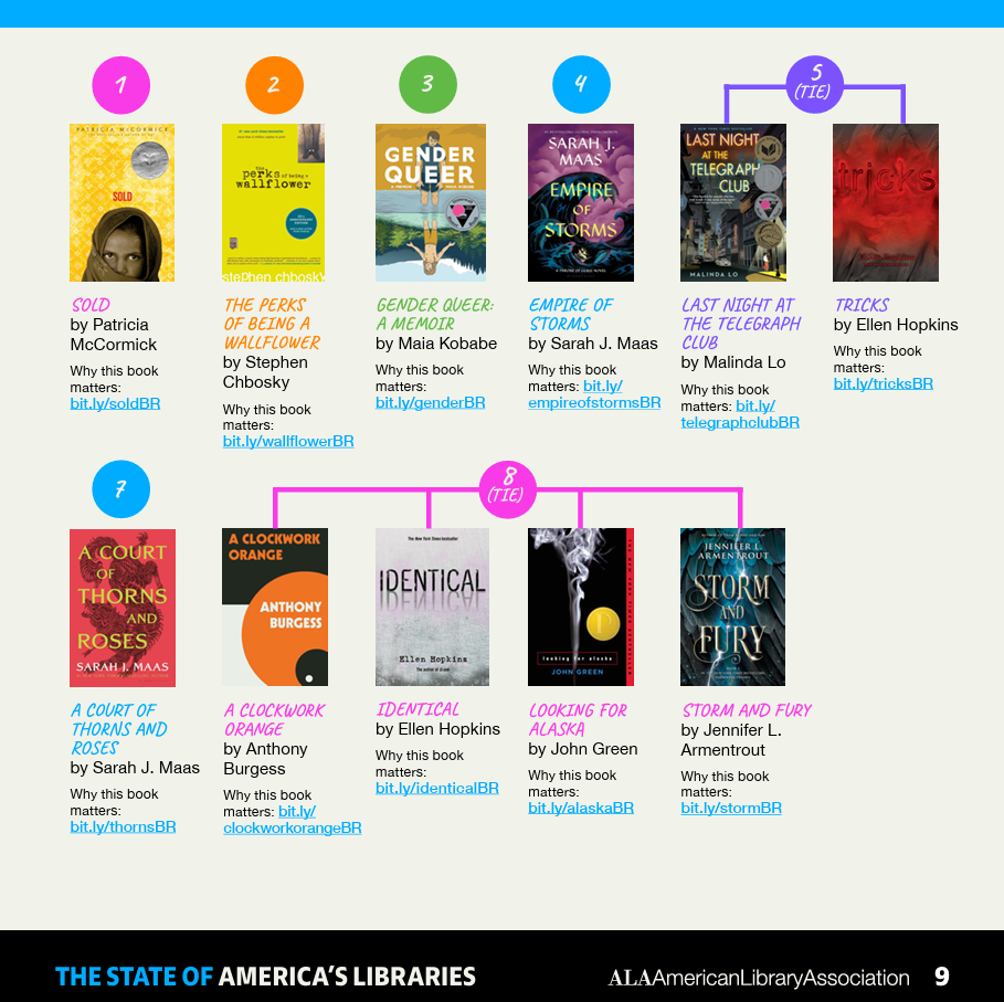 L’Office for Intellectual Freedom dell’ALA ha registrato l’anno scorso 4.235 titoli unici contestati, il secondo dato più alto mai documentato. Il record assoluto è di 4.240 nel 2023. Tra i libri più attaccati nel 2025, 1.671 (il 40%) rappresentano le esperienze di vita di persone parte della comunità LGBTQIA+ e di persone razzializzate. La lista è così composta: